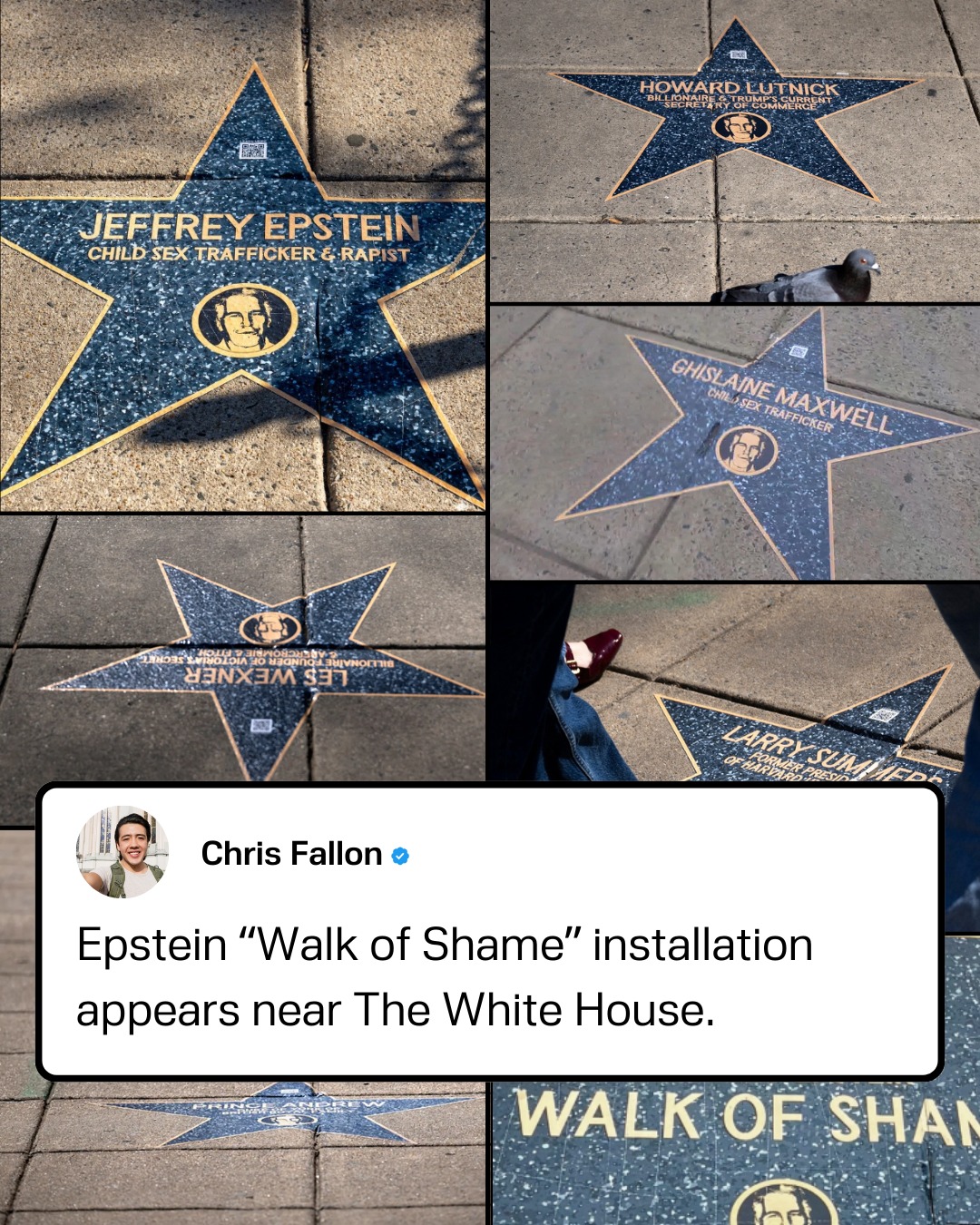 A guerrilla art installation called the “Jeffrey Epstein Walk of Shame” has appeared in Farragut Square, just a few minutes’ walk from the White House in Washington, D.C. The display mimics the Hollywood Walk of Fame but instead features stickers with names of politicians, billionaires and other high‑profile figures who are mentioned in the newly released Epstein files — public Department of Justice documents tied to Jeffrey Epstein. Each “star” includes a QR code that, when scanned, links to specific records or articles about that person’s alleged connection in the DOJ files.